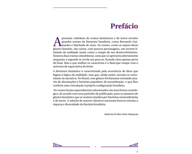 “Os contos foram especialmente selecionados em uma forma cronológica, de acordo com seus períodos de publicação, para os amantes do gênero fantástico que se sentem atraídos por histórias extraordinárias e de terror. A seleção de autores clássicos nacionais buscou retratar a riqueza e diversidade literária brasileira.” (Roberta De Bon Silva Mesquita)