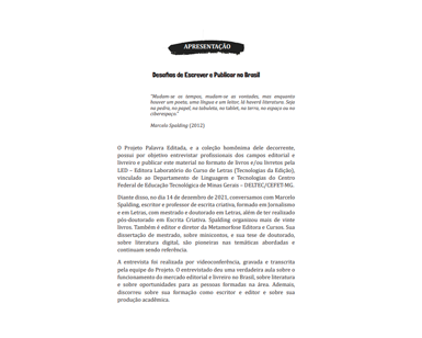 Para este volume, conversamos com Marcelo Spalding, escritor e professor de escrita criativa, formado em Jornalismo e em Letras, com mestrado e doutorado em Letras, além de ter realizado pós-doutorado em Escrita Criativa. Spalding organizou mais de vinte livros. Também é editor e diretor da Metamorfose Editora e Cursos. Sua dissertação de mestrado, sobre minicontos, e sua tese de doutorado, sobre literatura digital, são pioneiras nas temáticas abordadas e continuam sendo referência.