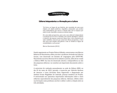 Dando seguimento ao Projeto Palavra Editada, conversamos com Marcos Roberto do Nascimento, editor, escritor e professor, formado em Ciências Sociais, com doutorado em Estudos de Linguagens pelo CEFET-MG. Nascimento escreveu diversos livros infantis e juvenis, além de ter criado a Editora MRN. Sua tese de doutorado aborda a independência ou não das pequenas editoras e se constitui um importante documento sobre o tema. O entrevistado nos apesentou importantes informações sobre o meio editorial, especialmente das pequenas editoras. Ademais, refletiu sobre sua formação como professor, escritor e editor e sobre a relação entre as três atividades.