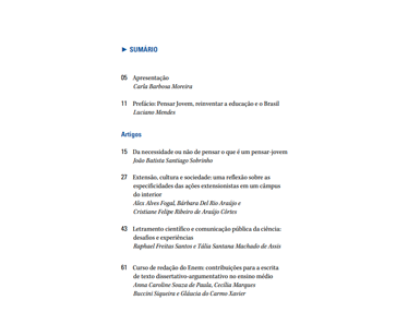 Este livro reúne artigos e relatos de experiência de estudantes e professores(as) da educação básica, sejam eles(as) extensionistas ou colaboradores(as) do Programa de Extensão Pensar Jovem (DEDC/CEFET-MG). Seu início coincide com a suspensão das aulas na instituição devido à pandemia de covid-19. Naquele difícil momento, ao mesmo tempo que tínhamos de lidar com dificuldades pessoais e restrições de toda ordem, fomos também compreendendo e descobrindo a potência da extensão e a importância do protagonismo juvenil; mas, principalmente, o que ainda há por ser feito para trabalhar as contradições desses sujeitos em suas diversidades social, econômica, política e educacional. Como o(a) jovem extensionista produz conhecimento ao fazer podcasts, programa de rádio, lives, coluna de jornal? Como se constroem sujeitos na relação com estudantes de outras redes públicas de ensino e entre diferentes níveis? Que conhecimentos e que imaginários colocam em circulação? Qual a importância e quais são as limitações da tecnologia como meio de produção-circulação do conhecimento? Nem todas essas perguntas têm respostas, mas trazemos aqui um terreno produtivo para encontrá-las.